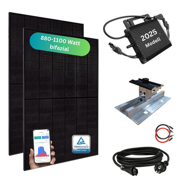 Die Ausgangsleistung darf max. 800 Watt betragen. Die Solarmodulleistung hingegen darf auch etwas höher sein, sodass wir Sets mit unterschiedlich großen Modulgrößen anbieten. Vom Standardmaß bis hin zu XXL Modulen.