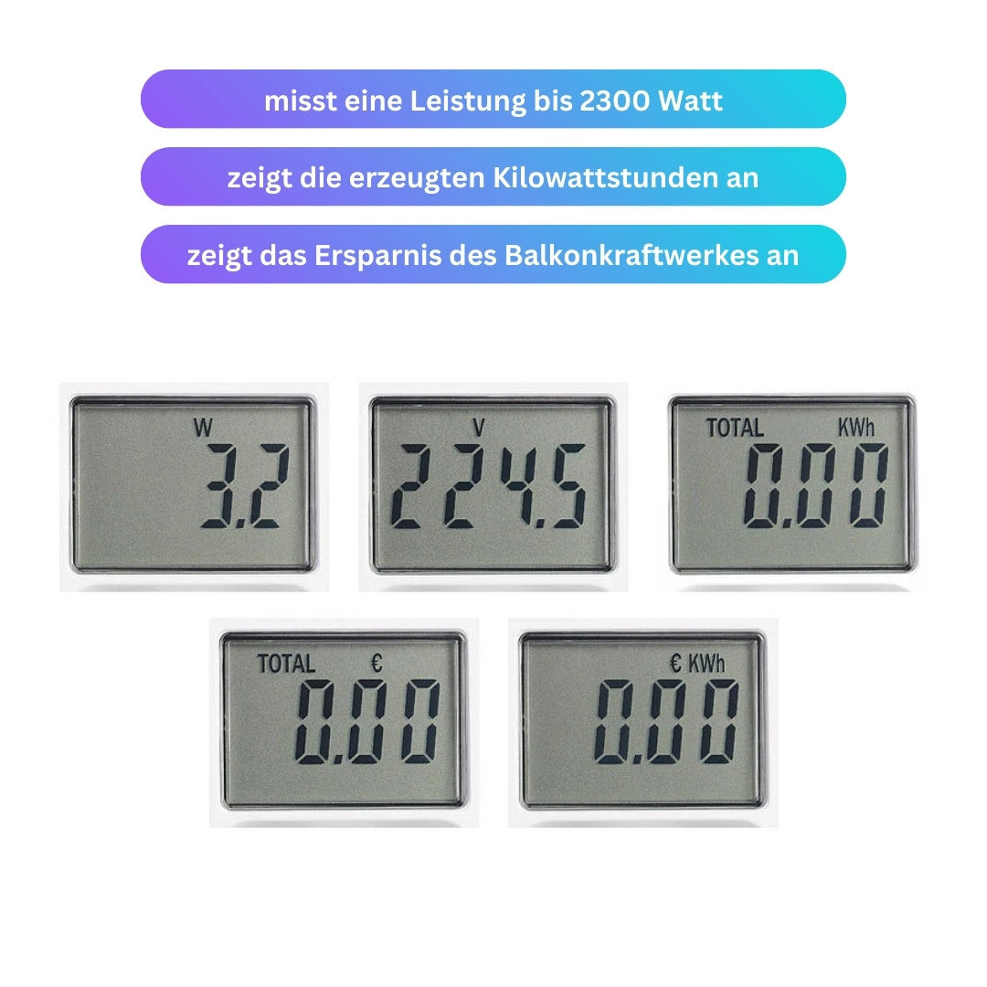 - Einfaches Messgerät um die Stromerzeugung zu beobachten. Misst sowohl die "Watt" Zahl in Echtzeit als auch die Gesamtleistung, welche jeden Tag aussummiert wird. Es kann auch ein Tarif hinterlegt werden. Für jeden sehr einfach zu bedienen.